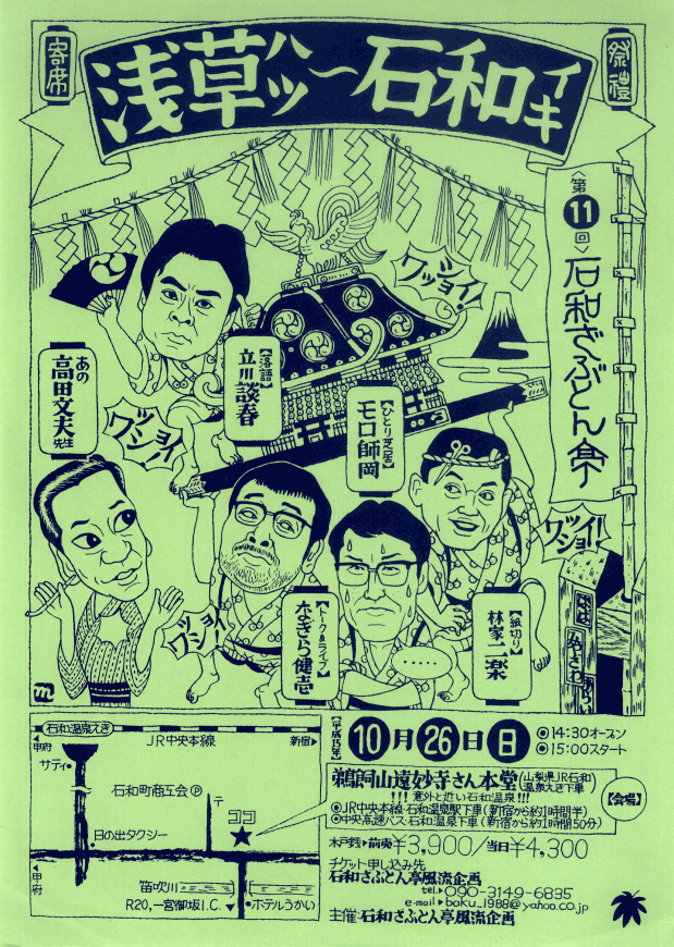 チケットお申し込み: ざぶとん亭風流企画 馬場 090ー3149ー6835 baku_1988@yahoo.co.jp 場所: ◯JR中央本線 石和温泉駅下車 徒歩10分(新宿から90分) ◯中央高速バス 石和温泉下車 徒歩3分(新宿110分) |