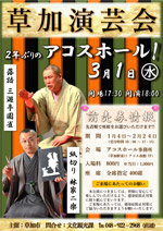 | 3月1日(水) 「草加演芸会」 「そうか宣伝隊長」による伝統芸能の披露を通じて、草加らしい文化や魅力を広く市内外へ発信する「草加演芸会」です ![]() |